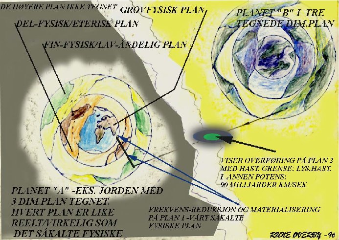 illustrasjon over de forskjellige plan - beliggende som forskjelligartede frekvenslag rundt om den fysiske jord - er hvert plan tilsynelatende er absolutt fast og virkelig for de som bebor planet. Bildet viser også en høyeredimensjonell "reise" mellom to forskjellige planeter på høyere astrale plan.