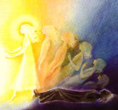 en illustrasjon av hvordan sjelen gjennom det astrale legemet frigjør seg fra sitt avdøde ytre hylster - den fysiske kroppen - og ledes til sin ferie- og videreutdannelses-sone, dersom den ikke blir "fanget i" det fysiske plans begrensede illusjoner også etter det dog kan dra videre i sin eterisk-astrale kropp. Bildet fra et hefte fra UNIVERSELLES LEBEN. (noe av stoffet derfra er oversatt til svensk - forespør til IRENE på mail)