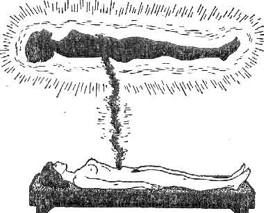 The cord, which we call the Silver Cord, connects the physical body and the astral body, for the cloud is in fact the astral body. Gradually this cord thins until at the end it withers, fades away, and parts. Only then is the body really dead, only then has the real person flown off to another life, to another stage of evolution. Once that misty figure has gone, it does not matter at all what happens to the fleshy envelope, it can be cremated or buried, it does not matter which. It is perhaps opportune to disgress here for a moment to issue what may be construed as a warning because so many people make it difficult indeed for the newly 'dead' to continue to live! When a person has died that person should be left untouched for two or three days if possible. It is definitely harmful to take the dead body and prop it up in a casket (oppstive i en likkiste) in some Funeral Home (begravelses-hus) and have a lot of well - meaning people go and mutter all sorts of wonderful tributes which most times they don't mean. Until the Silver Cord be severed and the Golden Bowl be shattered, the astral form floating can pick up the thoughts of those who are making comments at its passing. Further, if a body be cremated in less than three days, there is often intense pain caused to the astral figure, and the pain, curiously enough, is not the pain of hot fire but of intense cold. So if you value those who have gone on before, and if you will do as you would be done by, you will whenever possible ensure that a person who has died, has three clear days in which to sever and disassociate completely from the physical body.